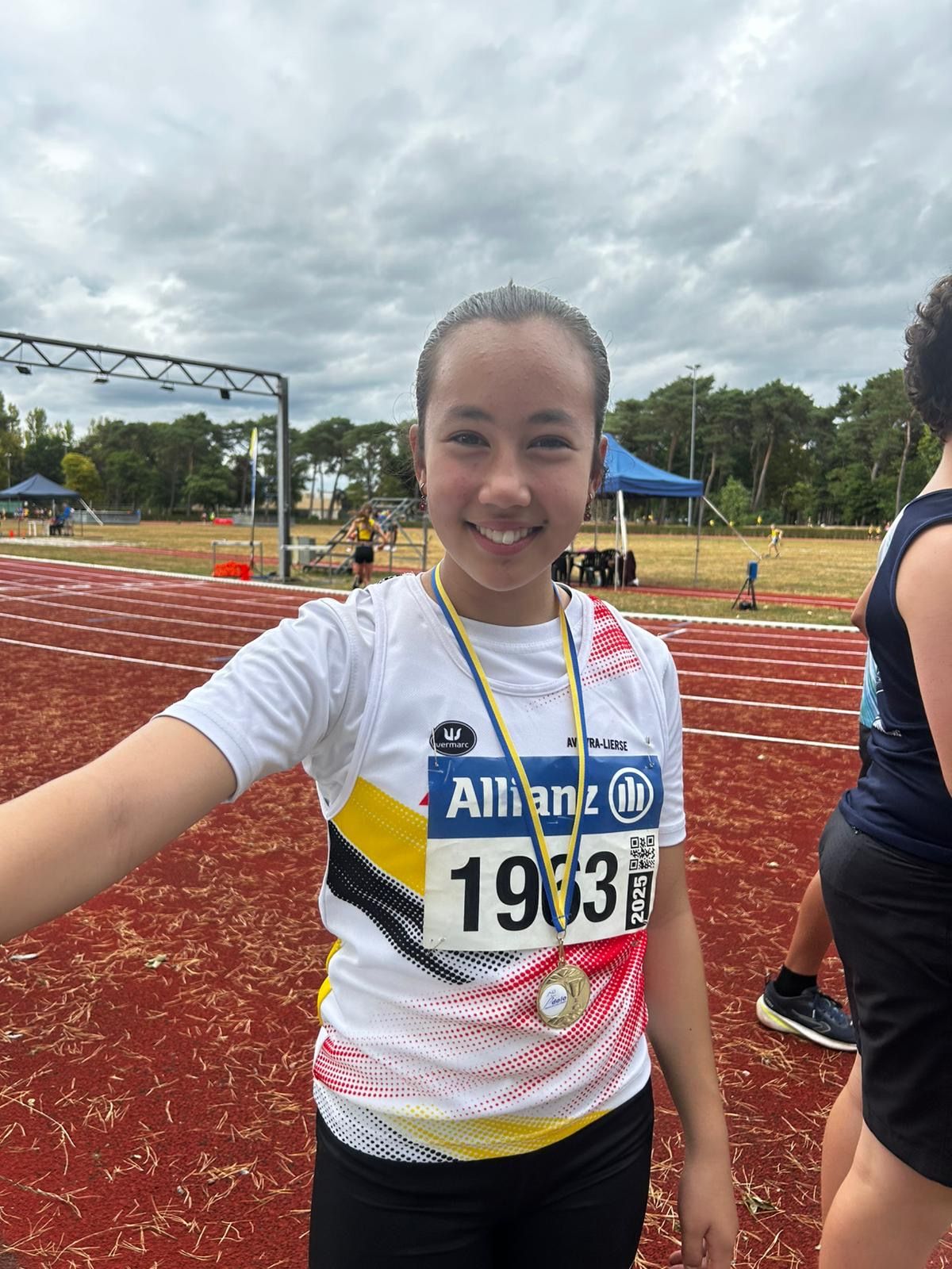 Hannah had duidelijk haar weekendje want in het Limburgse Lommel verbeterde ze voor de 3de keer haar clubrecord met liefst 34 cm naar 9m92 en kan nu stilaan uitkijken naar de 10m-grens. Op de spurt streek ze brons op met 9"23 en miste dat brons nipt met discus met een worp van 16m72. Bij ver sprong ze naar 3m40. Goed zo, Hannah!