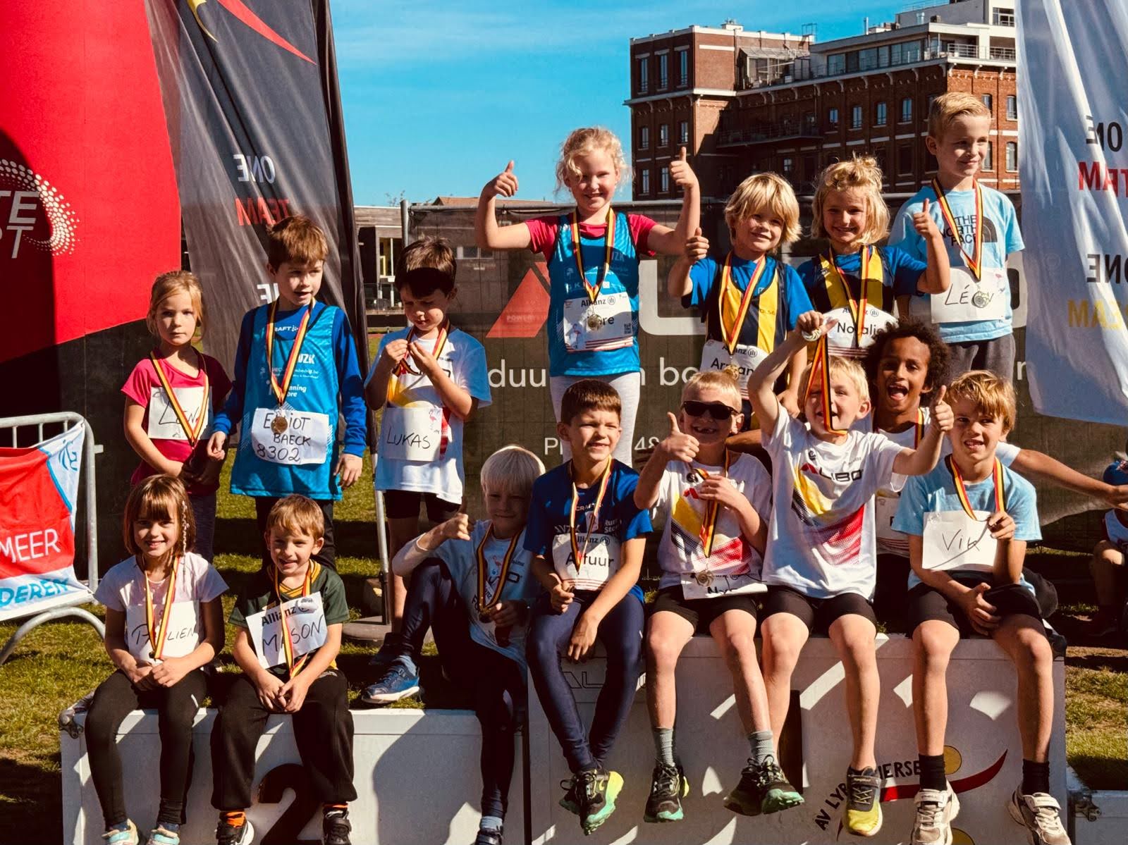 Een kleine 100 AVLL-jeugdatleten verzamelden onder een stralend zonnetje op onze piste voor de Finale van het Antwerps Jeugdcriterium. Het werd reeds een voltreffer in de voormiddag met de kangoeroes en benjamins die naar hartenlust spurtten, sprongen en wierpen. Alles verliep vlekkeloos dankzij de inzet van heel wat jeugdtrainers en ouders die de 'Beren', Flamingo's en Dino's Kangoeroes en de Mammoet, Slangen en Leeuwen benjamins begeleiden. Op het einde mocht iedereen het podium op voor een mooie herinneringsmedaille en een deugddoend en verfrissend ijsje. De foto's als bijlage spreken boekdelen... Na de middag verwelkomden we zo'n 200 pupillen en miniemen. Ook hier sneuvelden alweer talloze bestprestaties onder deze prima wedstrijdomstandigheden. 3 van onze Internationale atleten werden verwelkomd met een erehaag van AVLL-atleetjes. Lennert Van Dyck, als bronzen medaillewinnaar op de Jeugdolympiade in Skopje, Simon Verherstraeten als Falcon en Tornado Christian Iguacel, net terug van het WK in Tokyo, deelden met plezier de medailles uit aan hun 'opvolgers in spe'. Christian zorgde voor een primeur door de uitdaging aan te gaan met 5 miniemen jongens in de 'Run with a Champion'. Hij vertrok aan de 400m start en de miniemen aan de 300m startlijn. Het werd knap spannend en iedereen overtrof zich door allemaal mooie PR's neer te zetten onder de luide aanmoedigingen van de talrijk opgekomen supporters. Een leuk initiatief voor herhaling vatbaar! Hiermee werd het zomerseizoen 2025 afgesloten en kijken heel wat jeugdatleten naar de nieuwe categorie waarin ze vanaf oktober zullen terechtkomen.